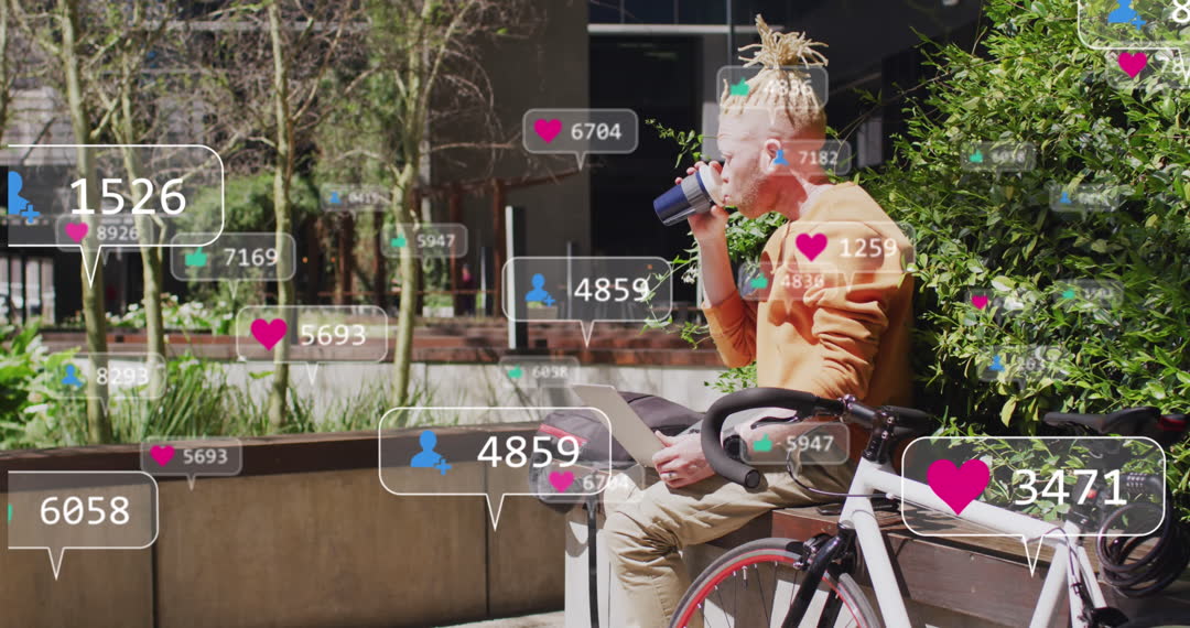 We see an albino man in a city drinking coffee while interactive social media graphics float around. This video connects themes of technology, modern communication, and everyday life, ideal for illustrating articles on social media trends, technology's role in society, or lifestyle blogs.