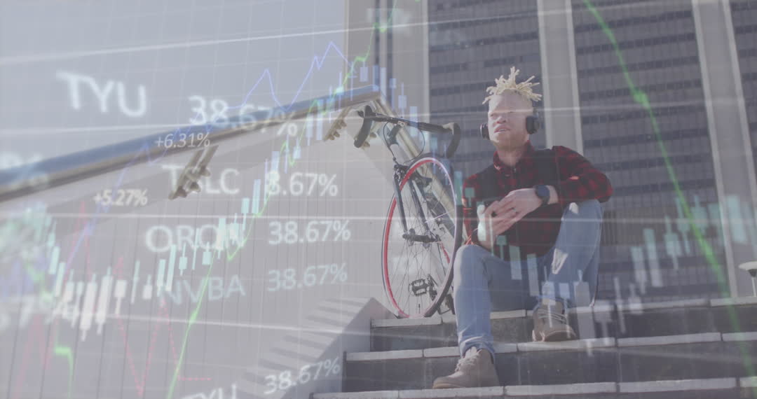 Conceptual video showing an albino man listening to music with headphones while sitting on stairs with his bicycle, overlayed with stock market data and graphs. This depiction represents the integration of technology and global economic trends in everyday life. Ideal for use in business tech articles, economic trend presentations, or advertisements targeting modern, tech-savvy audiences.