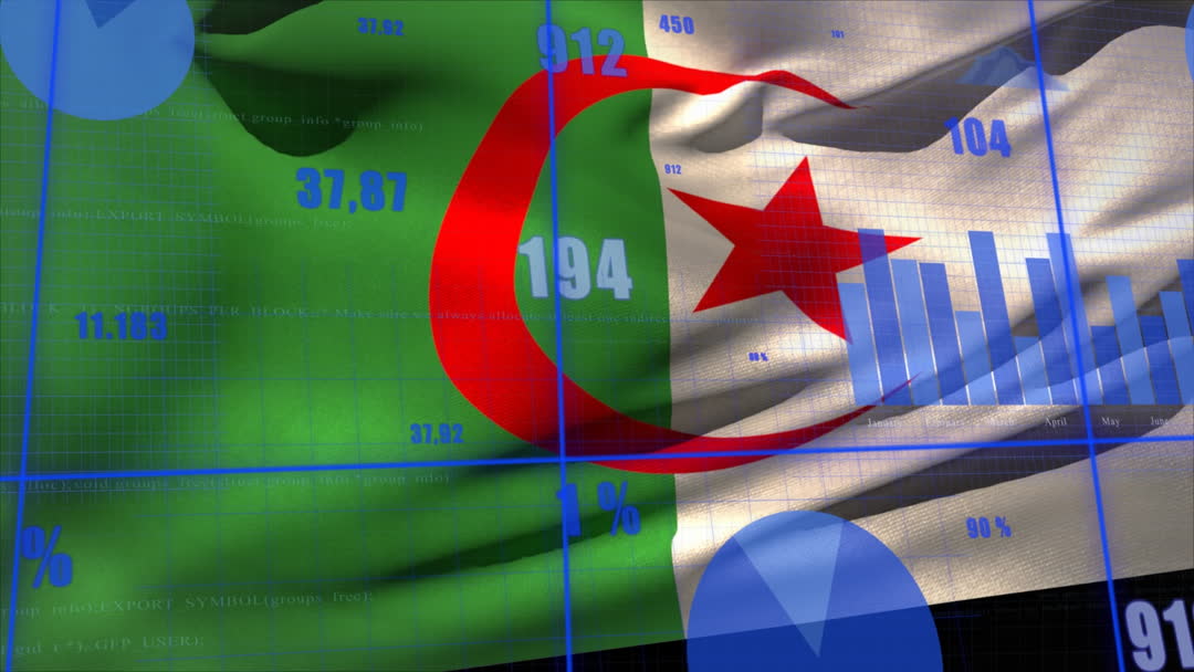 Graphic representation combining Algeria flag and financial data with animations and statistics visualizations. Suitable for use in presentations about Algeria's economy or financial markets. Useful for business reports, educational materials, or enhancing financial analyses related to Algeria.