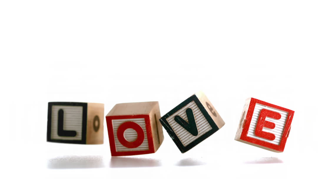 Letter blocks presenting the word 'LOVE' dynamically fall and bounce, offering a playful and engaging representation of emotion and childhood fun. Perfect for educational content, Valentine’s promotions, or playful decor.