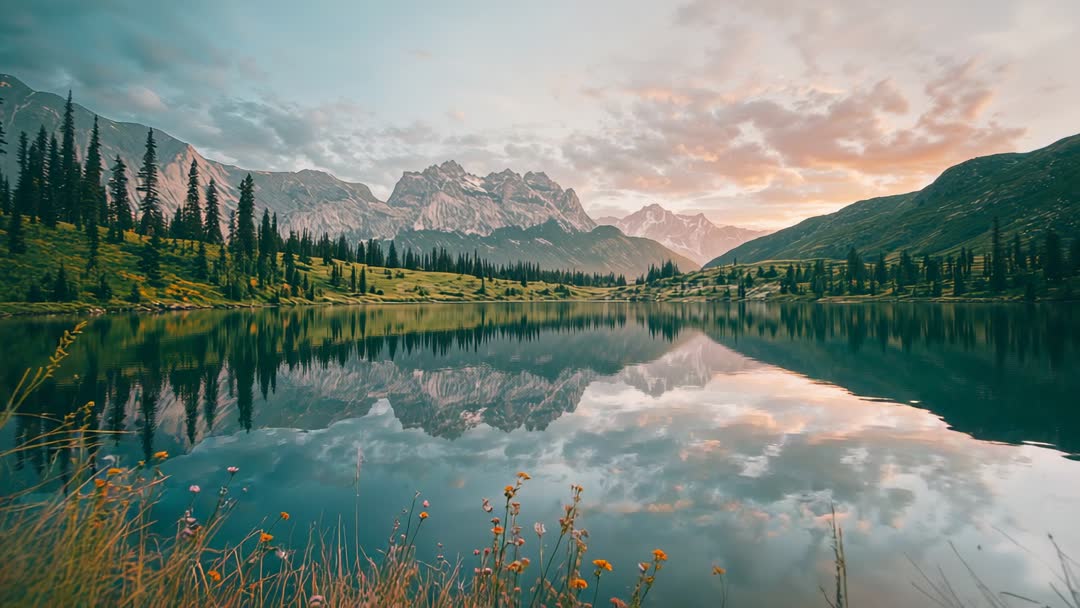 AI Generated Image. Video captures serene view of alpine lake reflecting majestic mountains at dawn. Wildflowers in foreground enhancing natural setting. Ideal for projects about nature, relaxation, or scenic travel destinations.