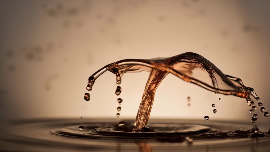 AI Generated Image. Showing amber liquid column colliding with incoming droplet and forming umbrella-shaped canopy over reflective basin. Capturing high-speed macro details of flying droplets, concentric ripples, and surface-tension dynamics with warm backlit gradient and subtle vignette. Fitting scientific and educational uses such as fluid dynamics demonstrations, slow-motion analysis, and lab presentation clips. Serving creative uses including beverage or cocktail advertising, abstract background loops, website hero banners, social media reels, motion design projects, and packaging visuals. Suggesting warm color grade, loopable edit, and export at 60–240 fps for smooth slow-motion playback. Including shot variations for still frames, cinemagraphs, and seamless looping animations.