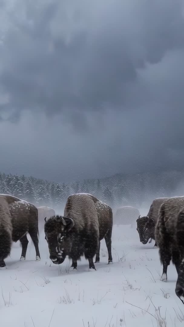 AI Generated Video. Showing herd of American bison moving across snowy plain, wind whipping drifting snow and fur frosting with ice crystals. Heavy overcast sky and distant conifer forest creating moody, cinematic atmosphere. Vertical framing optimizing clip for mobile platforms, social reels, and portrait ads. Footage working well for nature documentaries, conservation campaigns, winter travel promotions, outdoor apparel advertising, museum exhibits, and editorial stories about wildlife resilience. Postproduction suggestions: adding ambient wind sound and low-frequency rumble, applying cool blue color grade, slowing motion for dramatic emphasis, and looping short segments for background use. Licensing ideas: homepage hero banners, Instagram and TikTok reels, vertical ad spots, broadcast idents, and stock footage collections.