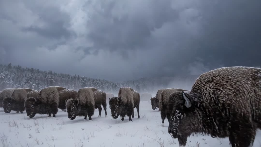 AI Generated Image. Herd of American bison driving across snow-covered prairie under dark storm clouds, wind blowing snow and frost collecting on heavy coats. Foreground animals grazing and moving slowly, distant herd trailing, conifer forest and low fog adding depth and mood. Footage working well for wildlife documentaries, climate and conservation stories, nature television, environmental news segments, outdoor brand campaigns, editorial spreads, book covers, calendars. Usage suggestions: using as dramatic opener, background plate for title sequences, cutaway for storytelling about migration and survival, hero visual for website headers, social media ads, print features. Technical notes: cinematic wide-angle composition, muted cold color palette, high atmospheric contrast, slow tracked movement matching slow-motion or time-lapse treatment.