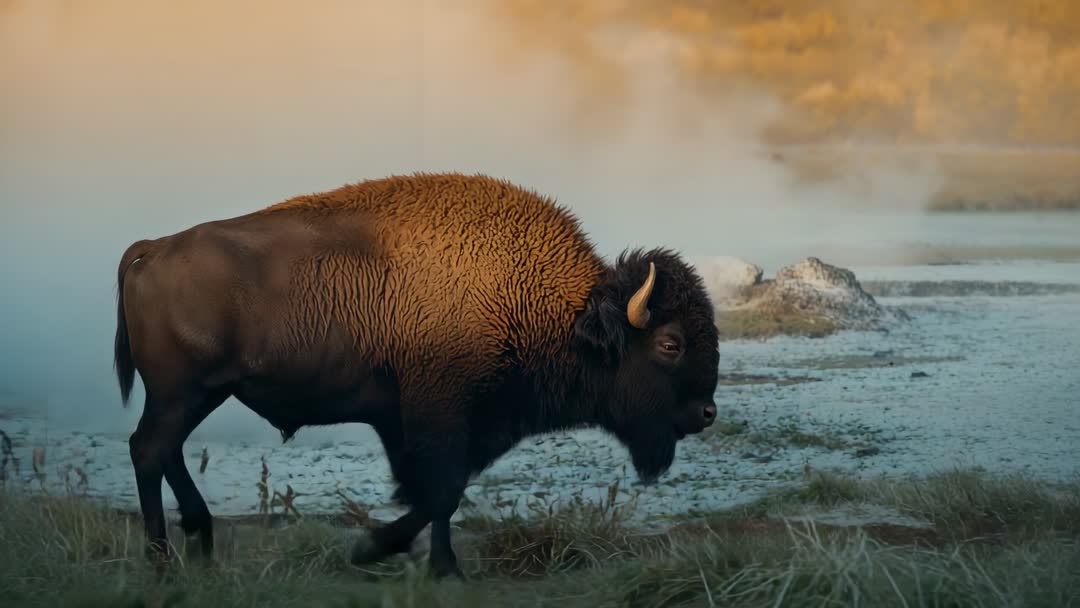 AI Generated Video. Showing American bison walking along grassy bank beside geothermal pool at sunrise, lowering head to graze on frosty vegetation while steam rising from hot spring. Focusing on solitary bison in profile, warm golden backlight contrasting with cool blue steam and textured fur detail. Working well for wildlife documentary sequences, nature and travel promos, environmental education and conservation campaigns, and editorial stories about geothermal landscapes. Enhancing marketing materials, website hero clips, and social media content when paired with ambient audio of steam and distant bird calls. Flagging as AI-generated when required by platform or client.