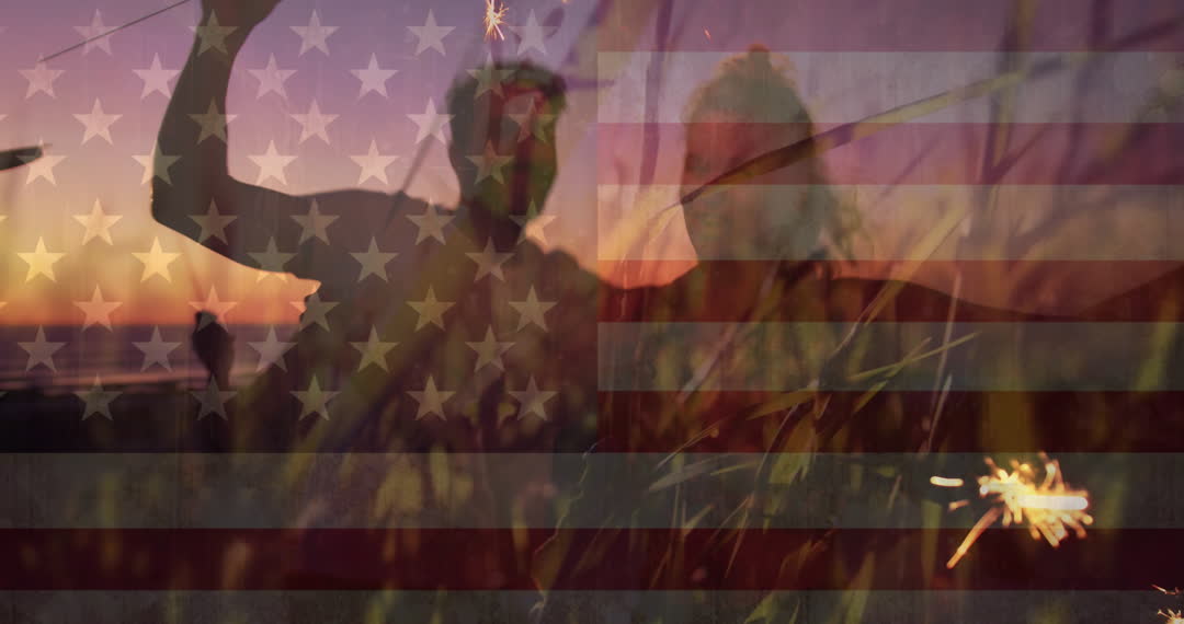Silhouettes of diverse individuals celebrating during sunset with sparklers, overlayed with the American flag. This visual representation of patriotism and unity captures an atmosphere of celebration and togetherness. Perfect for uses related to Fourth of July, patriotic events, and multicultural unity themes. Ideal for articles, blog posts, and promotional materials celebrating American spirit and diversity.