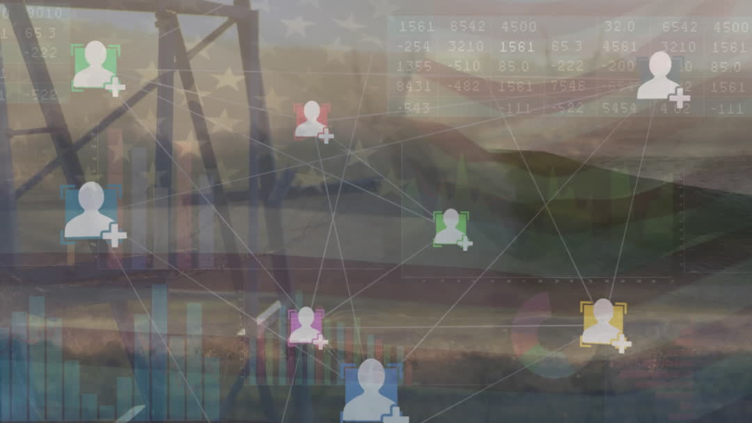 Digital composition features a blend of American flag videory and floating profile icons connected with lines, symbolizing interconnectedness and patriotism. Overlay includes financial data, infographics, and network pathways. Portrait used in projects about modern communication, finance analysis, technological identity infrastructure corporate presentations digital marketing campaigns emphasizing U.S.A. Innovation diversity reach for creative inclusion multimedia approaches compelling environment creation immersion through overlay vying cohesive multitailing symbiosis design balance interpretation.