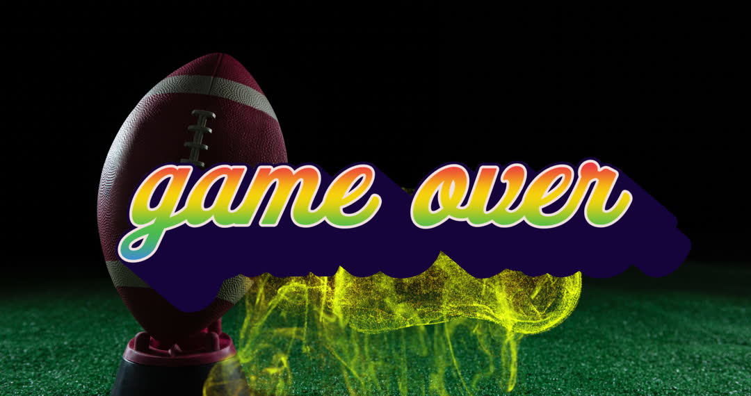 An American football stands upright on a holder on artificial turf against a dramatic black background. In front of the ball, the phrase 'game over' is displayed in colorful lettering, complemented by a vibrant yellow smoke effect swirling underneath. Useful for content related to sports conclusions, expressiveness in game play, and themed party invitations or decorations.
