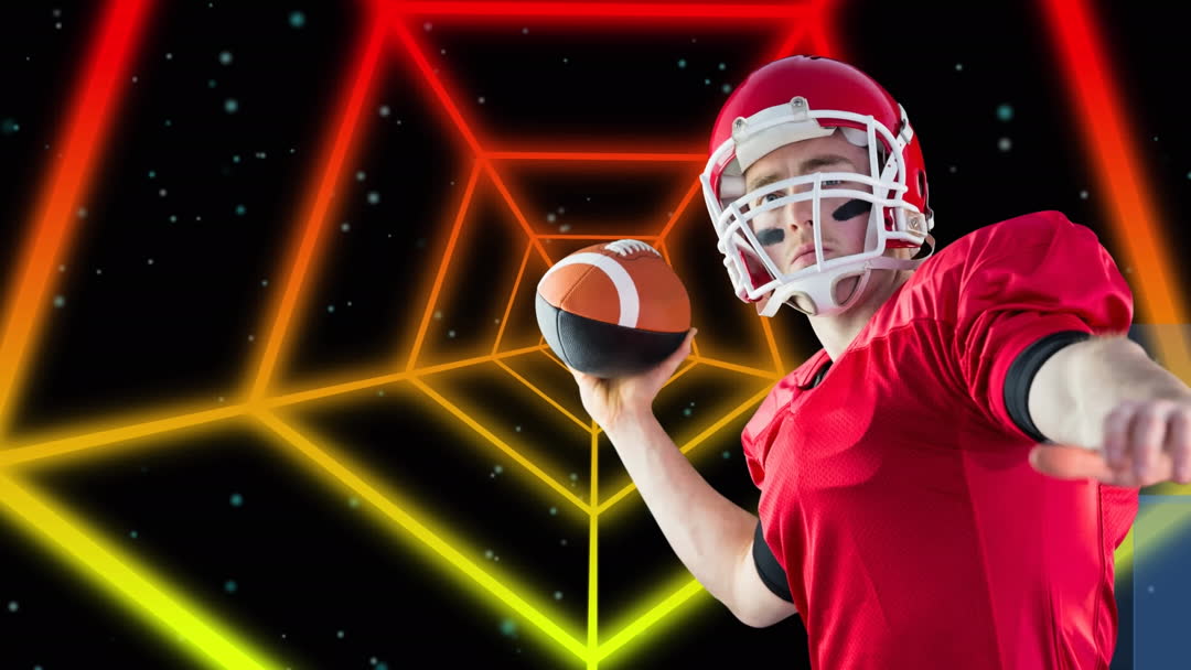 Energetic portrayal of an American football player poised to throw a football in a digitally animated, futuristic environment. Vibrant glowing lines create a dynamic feel, evoking the fast-paced nature of sports and technology. Suitable for use in virtual reality, sports tournament promotions, gaming, and technology themes.