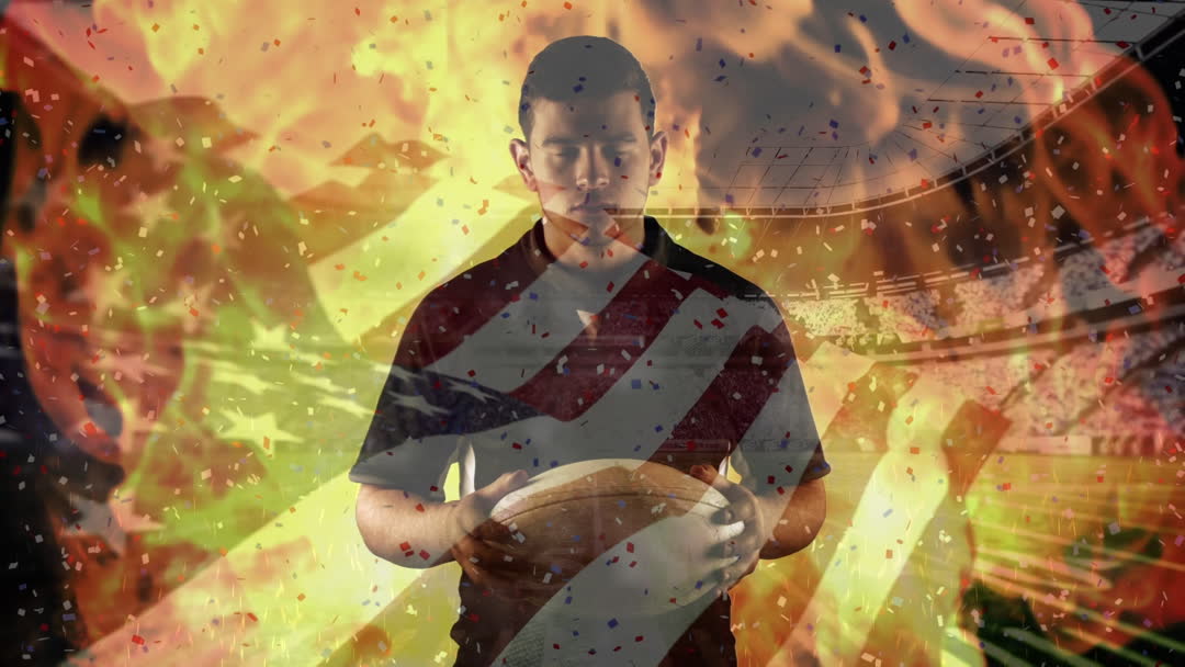 An American football player standing with a ball, featured against a dramatic digital background of the USA flag and confetti. The video symbolizes the spirit, strength, and patriotism connected to American football. Ideal for themes surrounding sports competition, patriotism, team inspiration, and advertisements celebrating national holidays or sports events.