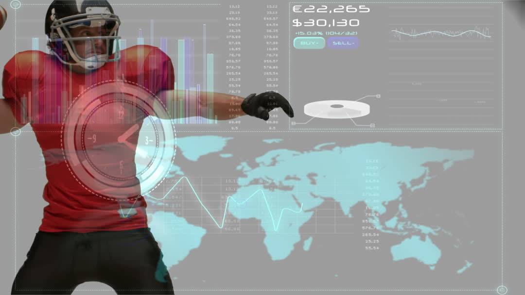 Futuristic digital interface projects overlay across American football player poised for action, suggesting advanced technological integration in sports. Graphical data and world map in background imply idea generation for global sports management, player performance analysis. Ideal for creating visuals in sports tech presentations or digital sports publications.