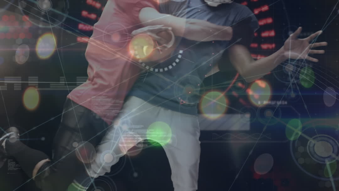 This dynamic video combines the action of American football with digital data overlays, illustrating the connection between sports and technology. The elements of networking and data processing create a futuristic atmosphere, making it perfect for uses related to sports technology, digital advancements in athletics, presentations on data analytics in sports, or marketing campaigns leveraging the integration of sports and tech.