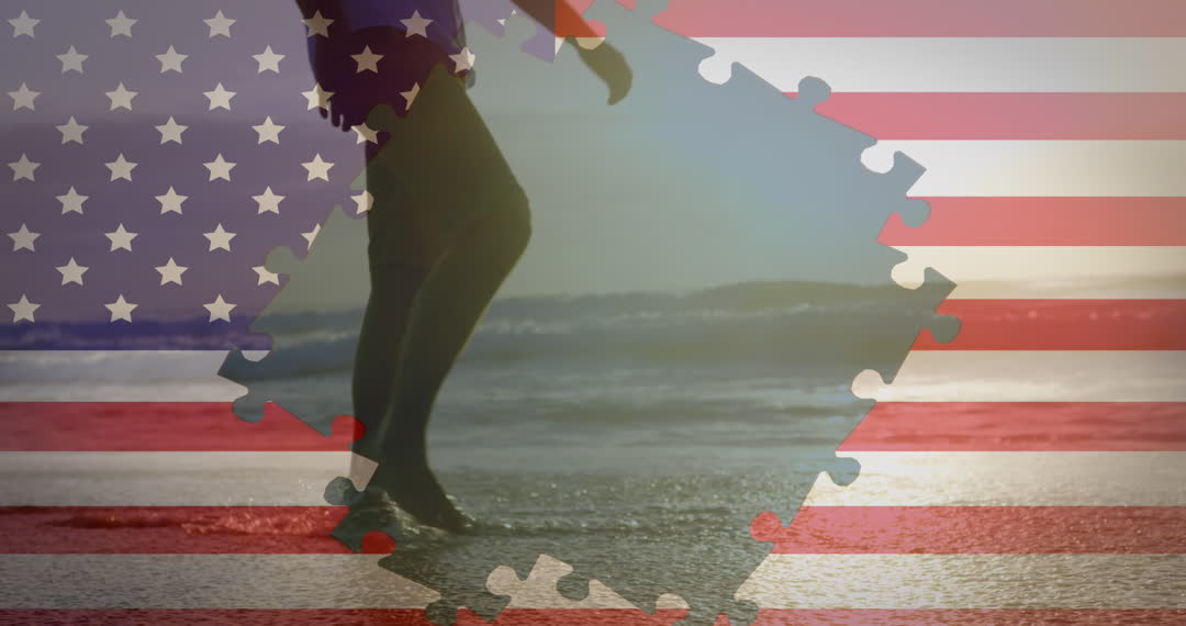 Features person walking along ocean shore with an overlay of the American flag, symbolizing freedom and patriotism. Suitable for themes of freedom, travel, or multicultural representation in American contexts, and ideal for use in advertising, editorial illustrations, or patriotic campaigns.