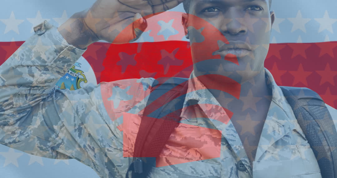 Depicts an American soldier saluting with the United States flag overlay. This evokes themes of patriotism, honor, and military service. Suitable for illustrating military or patriotic articles and promotional materials related to defense services or national observances.