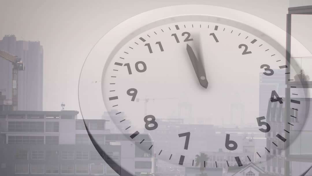 Video clip showing analog clock hands sweeping clockwise with blurred trails, overlaid on hazy urban skyline and highrise silhouettes. Visual language conveying passing time, deadline pressure, schedule urgency, and urban pace. Neutral muted tones and soft focus creating cinematic, contemplative mood. Suitable for use as opener or background for corporate presentations, productivity tutorials, time-management training, news segments about schedule changes, countdown sequences for events, or social media short clips about work-life balance. Technical notes: clip working well as loopable background, recommended editing techniques including slow speed ramping, opacity blending, text overlay on left or top, adding ambient or rhythmic soundtrack, or using color grading to match branding. Aspect ratio compatible with widescreen projects. Licensing suggestions: use for commercial storytelling, marketing campaigns, broadcast bumpers, and internal training videos.
