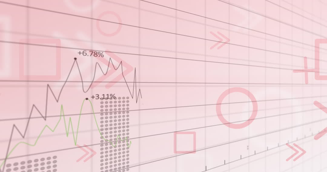 A digital screen showcasing abstract graphs and shapes in light pink tones. Lines and geometric elements symbolize data analytics and trends. Useful for illustrating concepts in finance, market analysis, or technological advancements within digital content, presentations, or reports. Perfect for conveying modernity and innovation in visually engaging financial and tech projects.