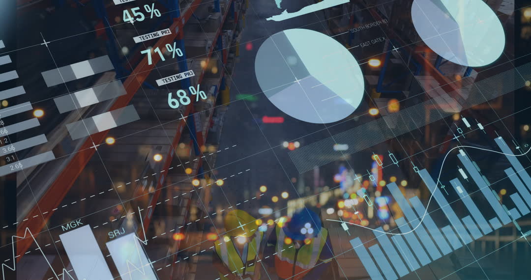 Visual illustrating the integration of financial data with warehouse operations, featuring overlapping graphs and statistics with background focus on male warehouse workers. Useful for themes related to business growth, data analysis in logistics, operational efficiency, and innovative economy strategies.