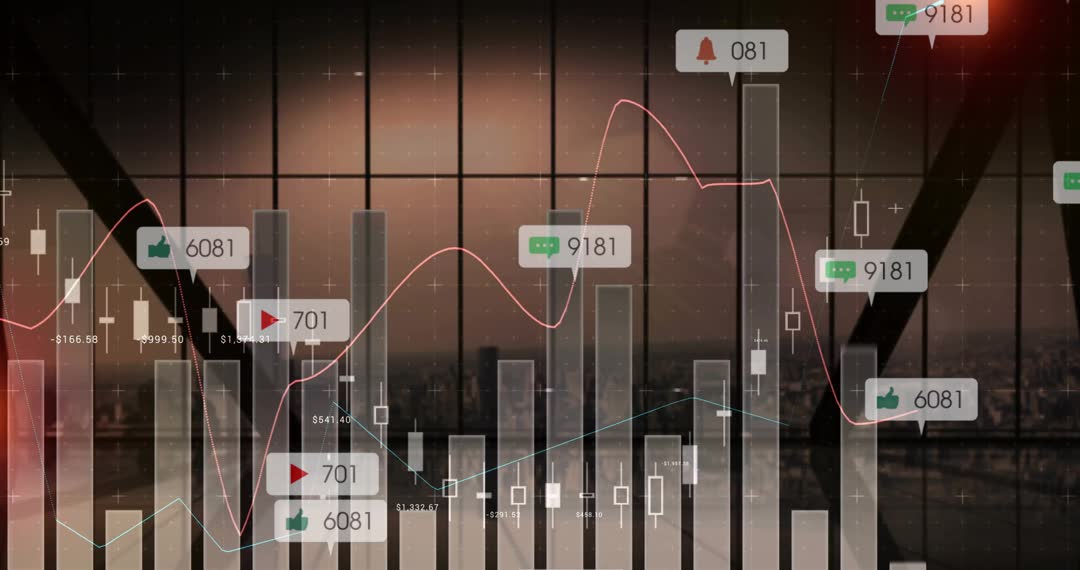 Overlay of analytical graphs with digital social media notifications against city skyline creates modern technology data representation. Ideal for use in digital marketing presentations, fintech apps, technology blogs, and business analyst reports highlighting data insights and digital engagement metrics.