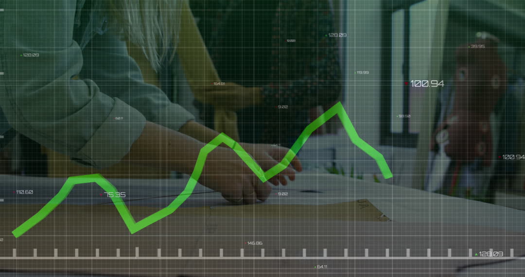 Business growth concept featuring digitized graphs layered over a designer working on fabric patterns. Useful for visualizing complex ideas in financial reports, business presentations, and design projects.