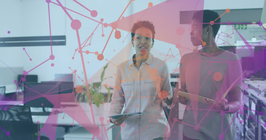 Female office employees involved in collaborative efforts while analyzing graphic data overlays in a modern technological workspace. This vibrant visual could be ideal for illustrating themes of digital transformation in business presentations, corporate communication materials, or advertisements highlighting professional teamwork and enhanced productivity through technology.