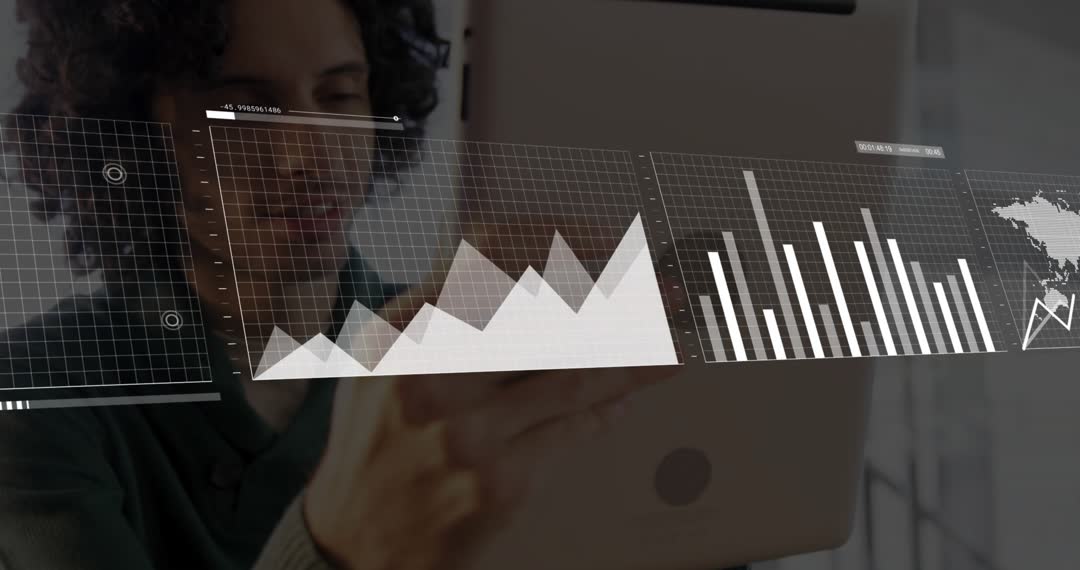 Engaging video of a person using a tablet showing overlay of line and bar graphs with a world map, showcasing financial analytics and data visualization. Perfect for illustrating themes of technology in finance, data-driven decision-making, and innovation in business strategies.