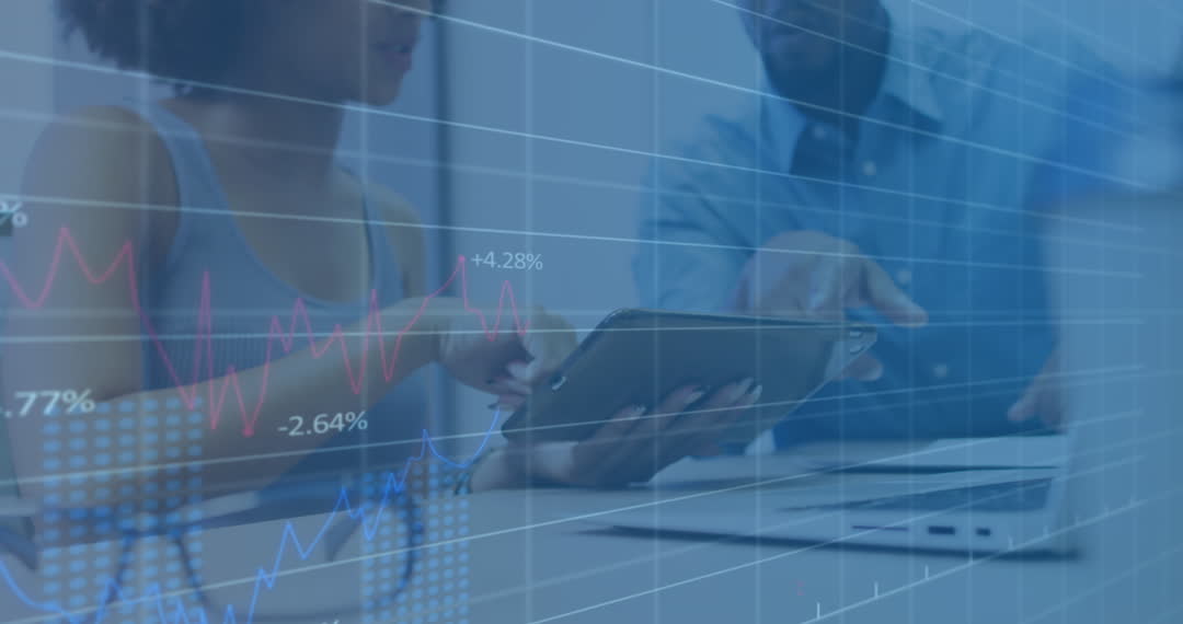 This dynamic visualization focuses on a digital collaboration scene where two individuals analyze financial data on a tablet against a background of financial graphs and data visualization. This concept demonstrates the integration of technology in data-driven decision-making. Useful for illustrating business analysis, financial planning, and the innovative application of digital tools in professional settings.