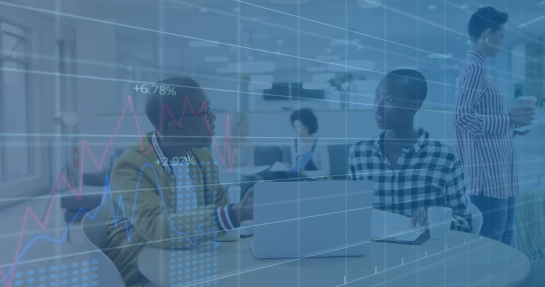 This video shows diverse business professionals engaged in analyzing financial data using a laptop in a modern office setting. The overlaid graphical data represents concepts of teamwork involving technology and finance. Ideal for presentations, articles on business strategy, or illustrating corporate collaboration themes.