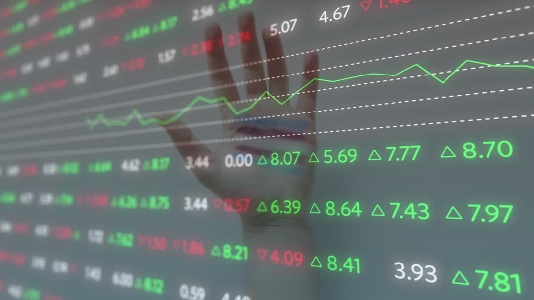 A hand is interacting with a digital display of financial charts showing changing market data. The video visualizes innovation in financial technology and data processing through a virtual interface. This is ideal for depicting themes of digital finance, stock market insights, economic analysis, and the growing influence of technology in investment platforms. Can be used in articles or presentations about modern finance and fintech solutions, or in advertising for finance-related products or services.