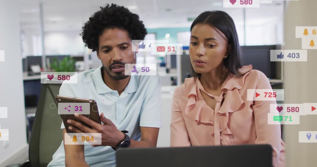In this scene, two coworkers sit together, concentrating on analyzing real-time engagement metrics displayed on digital devices. Floating symbols representing analytics data like likes, comments, and shares create a dynamic and interactive ambiance. This visual captures essence of modern business environments where teamwork and digital analytics are crucial for marketing success. Ideal for promoting collaboration tools, digital marketing solutions, or illustrating teamwork and business productivity.