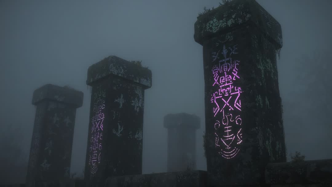 AI Generated Image. Video clip showing ancient stone pillars revealing glowing violet runes across misty ruins, with moss-covered faces and drifting fog. Neon glyphs pulsing along pillar surfaces, casting soft purple light onto wet stone. Composition favoring cinematic widescreen and low-key mood, creating mysterious otherworldly atmosphere. Serving as cinematic background for fantasy game trailers, supernatural book trailers, title sequences, and VFX demonstrations. Suiting marketing for film, gaming, music, apps, and concept art portfolios, serving as atmospheric hero for websites and social posts. Featuring cool blue-gray palette contrasted by vibrant violet neon, supporting dramatic color grading and immersive sound design. Providing strong visual anchor for storytelling about ancient secrets, rituals, or mystical technology.