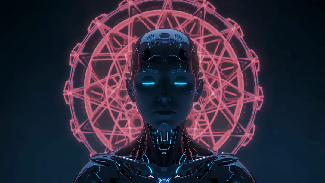 AI Generated Image. Digital masterpiece showcasing an androgynous android with subtle cyan pulses indicating activation. The android is set against a void, featuring a captivating neon pink mandala spinning in the background. Ideal for sci-fi, technology themed marketing, presentations, or backgrounds. This AI-generated art piece communicates an intersection of technology and spirituality, intriguing for futurism and digital art discussions.