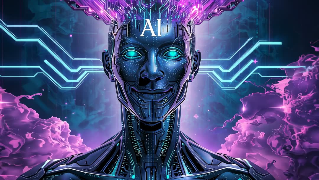 AI Generated Image. Futuristic android head powering up while sending neon-blue data traces into surrounding neural network. Cyan circuitry lines radiating from sides, circuit crown merging with purple nebula backdrop. Eyes pulsing with electric cyan light, facial plating revealing intricate microchip pathways and glowing nodes. Visual tone blending cyberpunk aesthetics with cosmic, high-tech energy. Usage suggestions: Ideal for tech promo videos, AI conference openers, startup pitch decks, product launch reels for machine learning and robotics, cybersecurity and cloud computing marketing, editorial motion graphics for AI articles, sci-fi trailers, website hero backgrounds, social media clips, and conference title sequences. Useful for creating looping animated background, title reveals, lower-thirds overlays, and cover art for reports. Color palette ready for neon purple and cyan grading.