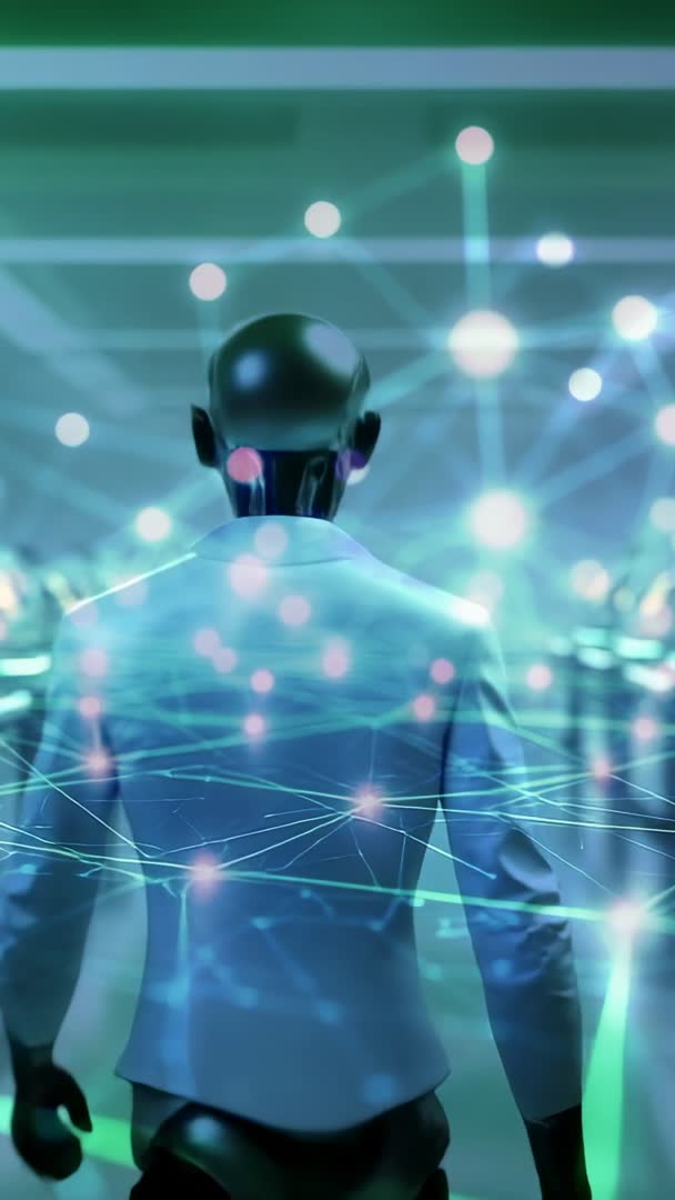 AI Generated Image. Vertical video showing android pivoting head while data matrix activating and neural lines connecting across frame. Blazer-clad humanoid moving through expansive data hall with cinematic lighting and depth. Visual palette blending teal and violet highlights with glowing nodes and motion trails, suggesting connectivity and advanced intelligence. Serving well for mobile ads, app intros, social media reels, corporate presentations, keynote openers, product launch teasers, cybersecurity campaigns, AI research promos. Editing tips: looping short segment for seamless background, adding logo reveal and lower third, syncing beats with electronic sound design, applying subtle color grade to match brand. Deliverable suggestions: 9:16 aspect ratio masters, short 6-15 second cuts for reels, longer 30-60 second edits for presentation intros.