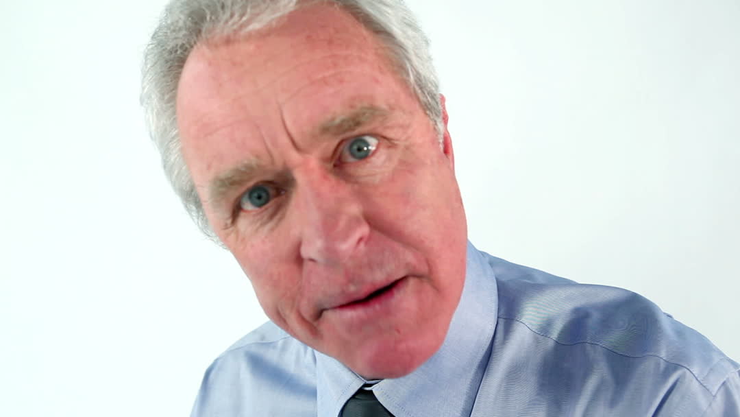 Close-up view of an older man in business attire showing expression of anger while using megaphone. Emotion depicted in intense, vivid detail against clean white backdrop; emphasizing communicative force or authority. Suitable for illustrating themes of authority, communication breakdown, emotional expression, leadership dynamics, or advertising attention.