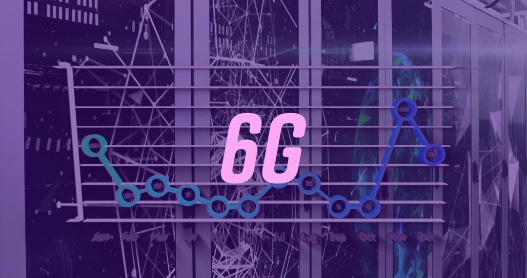 Animated visualization focusing on emerging 6G network technology. Features dynamic graphs over a server room backdrop, suggesting themes of connectivity and future technology. Useful for presentations, articles, or educational content about the evolution of communication technology, future networks, and data management innovations.
