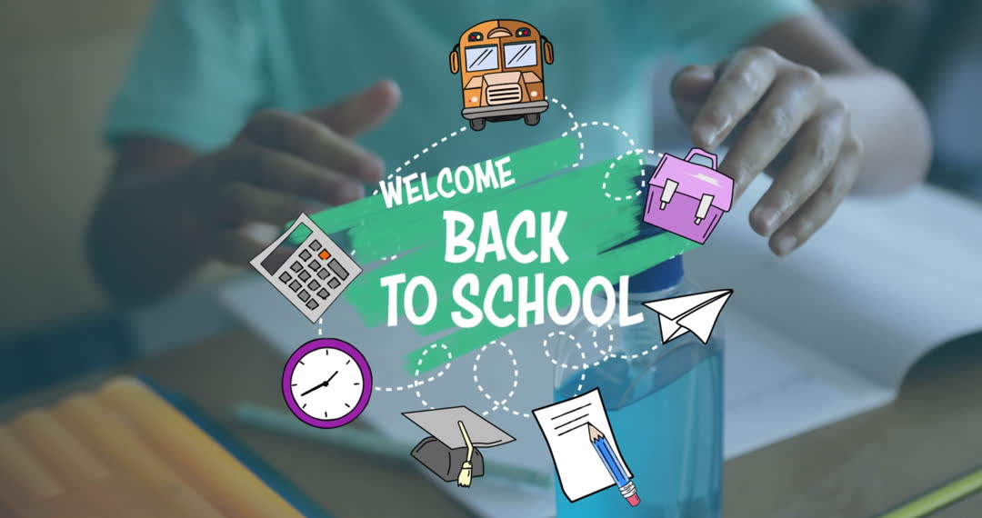 Bright animation featuring 'Welcome Back to School' text surrounded by fun educational icons like a school bus, ruler, and graduation cap. Ideal for educational campaigns, school announcements, virtual learning platforms, or engaging digital media promotions for the start of a new school year.
