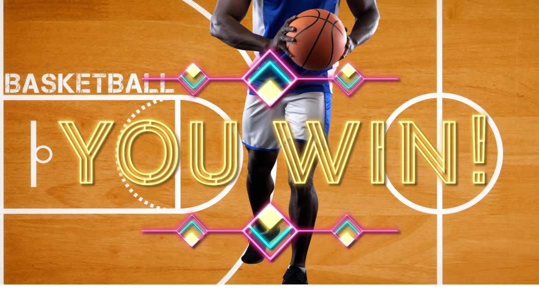 Dynamic concept with a basketball player in mid-action and prominent 'You Win' text. Useful for sports apps, motivational videos, and digital celebrations of victory in athletic contexts.