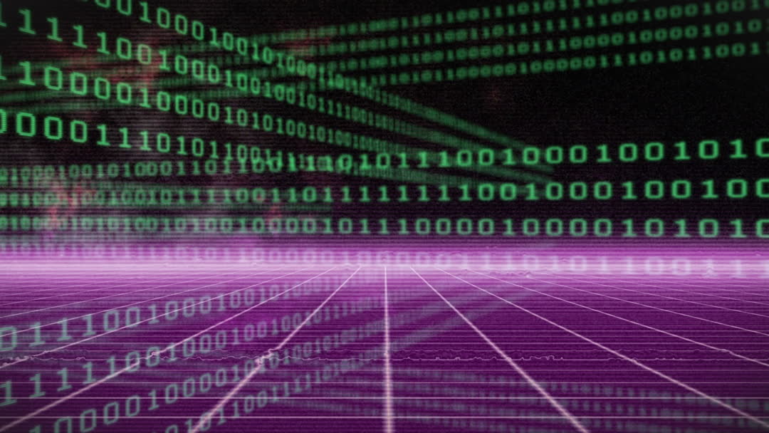 Futuristic animation depicting moving binary code and data processing against a computer-generated grid backdrop, conveying a sense of technology and innovation. Useful for illustrating digital themes, technology documentaries, gaming environments, and online content about data processing and coding.