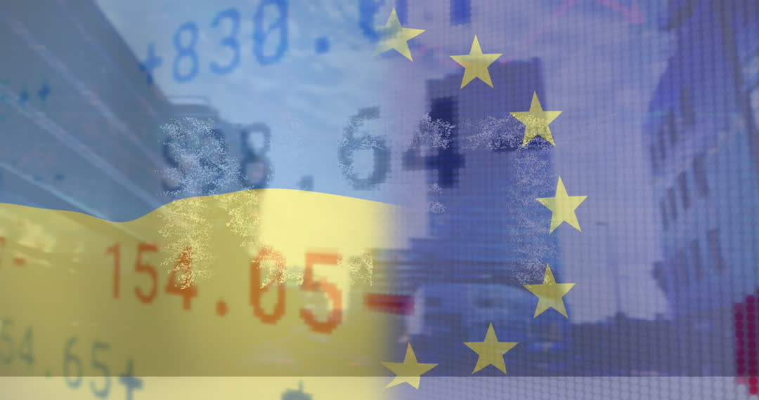 This illustration shows the fusion of Ukraine and EU flags overlaid with stock market data and urban scenery, suggesting European economic integration or influence in Ukraine. Useful for themes of international business, economic analysis, trade relations, and political-economic articles or presentations concerning Europe.