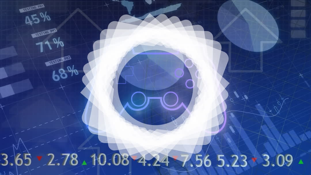 This visual showcases animated elements of statistics and data processing over a blue background, ideal for presentations involving technology, finance, and data analytics. Use it for backgrounds during financial briefings or discussions about statistical analysis and global computing trends.