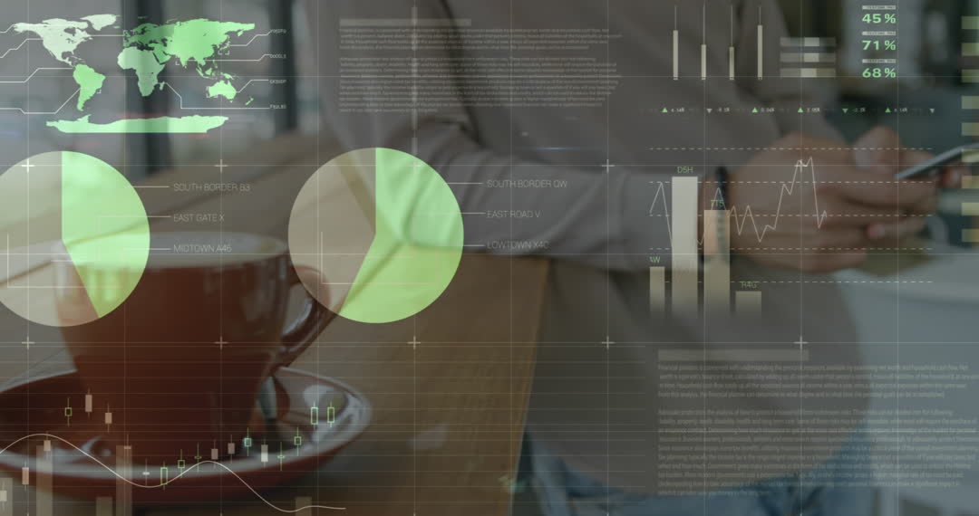 An animation showcases intricate business analytics as data overlays a scene with a person using a smartphone. Global statistics and data visualization, along with modern charts and graphs, are prominent. Users in finance, global business firms, or digital interface design might find this visual engaging for presentations, reports, or marketing assets showcasing data-driven technology solutions.