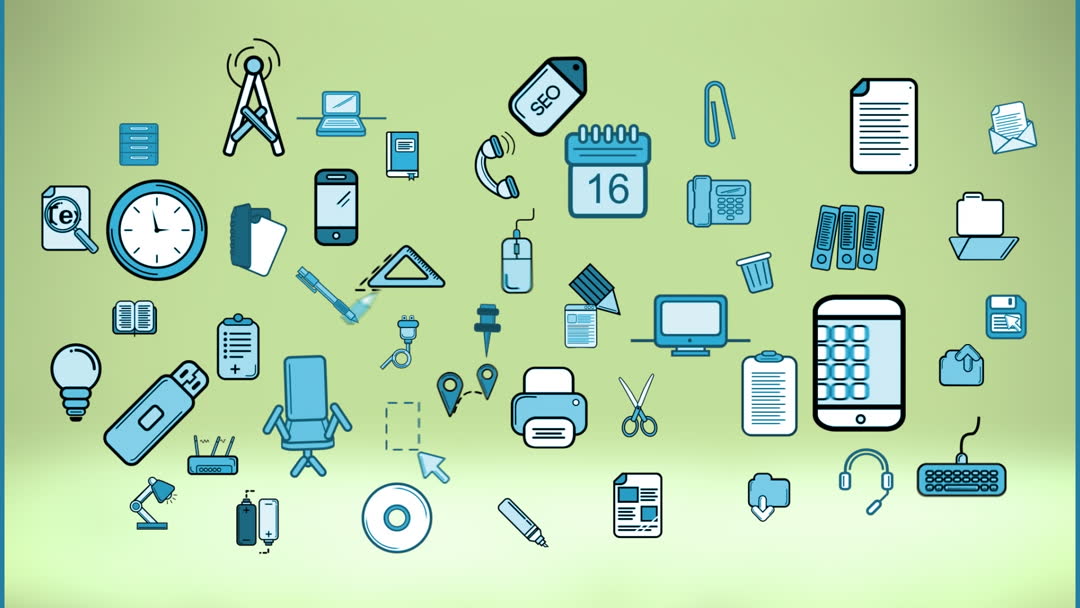 Set featuring animated icons representing various aspects of business communication and office tools. This vibrant display, set against a green background, includes elements like smartphones, clocks, folders, and digital marketing symbols. Ideal for use in presentations, educational videos, technology showcases, or to add a dynamic touch to business-related content.