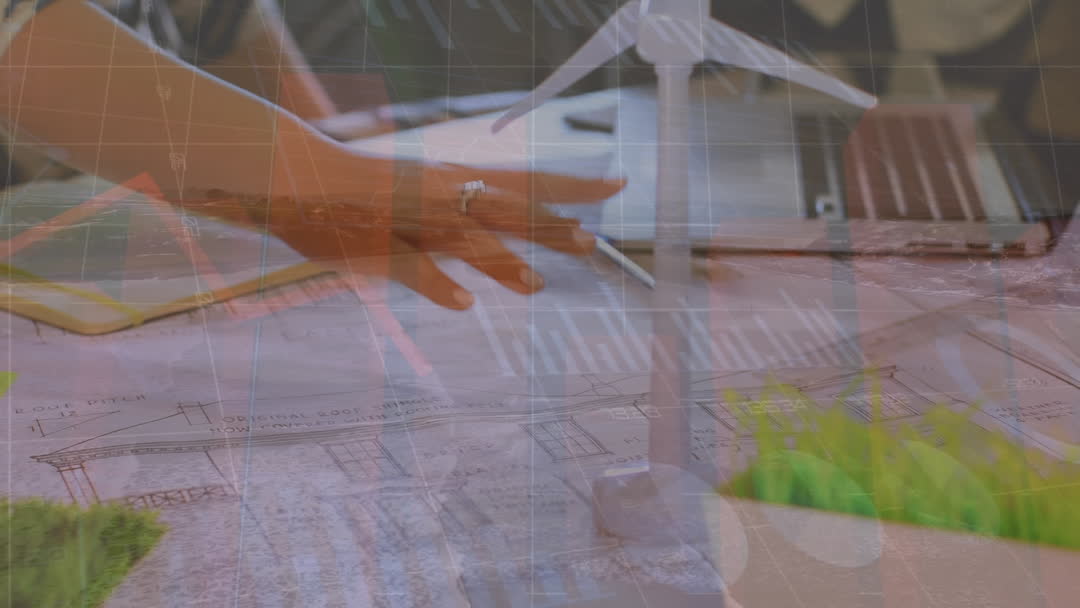 Animated overlay featuring data analytics processing alongside eco designs creates dynamic composition illustrating intersection of technology and sustainable solutions in business context. Suitable for demonstrations in presentations, articles on technology in business, promoting environmentally-friendly practices, or illustrating corporate planning sessions focused on innovative solutions.