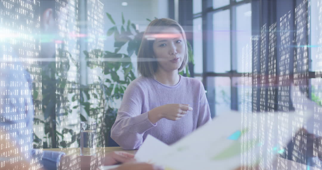 Business professionals sitting together in modern office space, holding intense conversation. Large digital data binary codes superimposed over scene, suggesting advanced technological concepts. Suitable for depicting modern/global business topics, technology integration, emphasizing teamwork/emerging trends.
