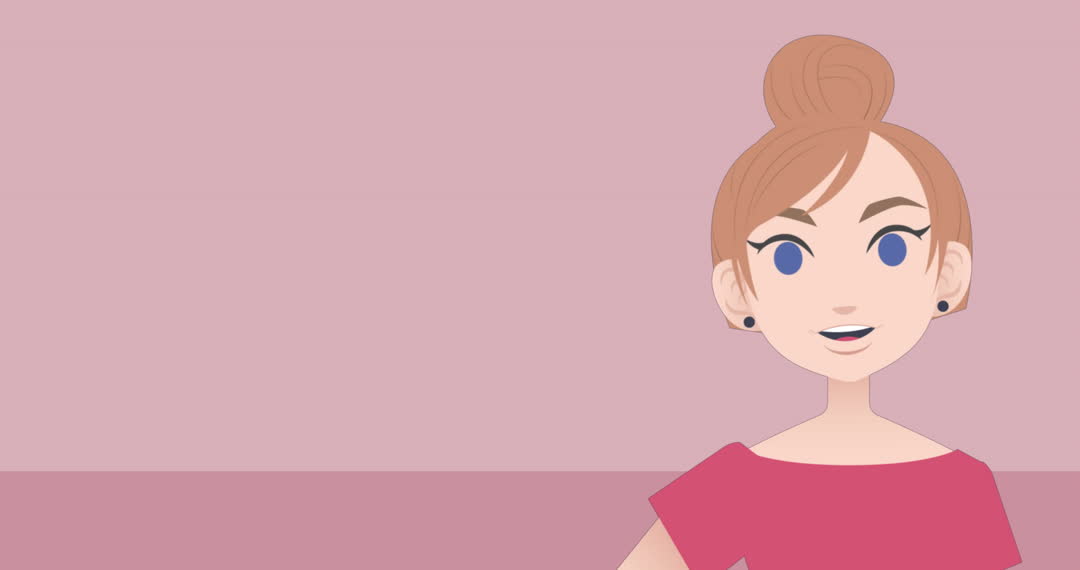 Animated businesswoman in simple neuromorphic style wears pink top, speaking expression, highlighted against pink backdrop. Useful for digital interfaces, concept presentations, and avatar creation in business settings.