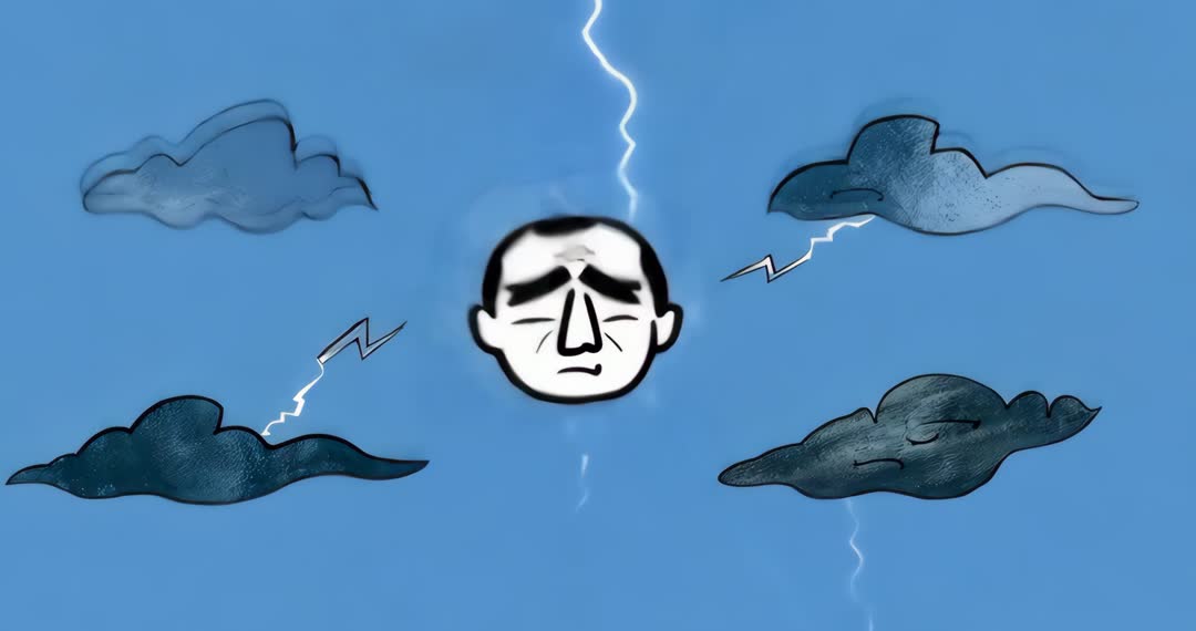 AI Generated Image. This video frame depicts a creatively animated scene where an illustrated head is surrounded by storm clouds in a blue sky. Flickering lightning emerges from the clouds, adding drama and emotion to the expressive face in the center. Useful for artistic or emotional projects focusing on themes of turmoil, drama, or introspection. The animation could complement digital storytelling or illustrative entertainment projects.