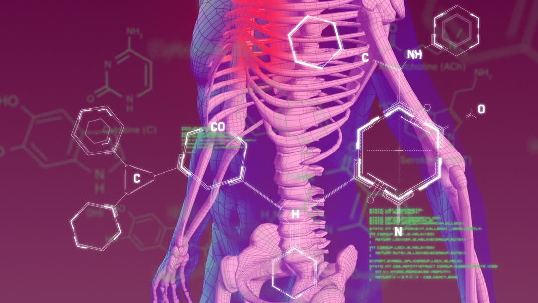 Illustration of animated chemical formulas layered over a human skeleton model, set on a purple background. The video suggests themes of scientific research, digital technology, and futuristic data processing. It is useful for content in healthcare innovation, scientific exploration, or educational materials on human anatomy and chemistry.