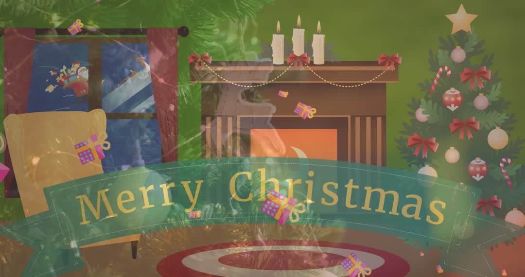 This cheerful animation features a 'Merry Christmas' greeting amidst a cozy interior with traditional festive decorations like a lit fireplace, ornaments, and a Christm??as? tree adorned with bows and gifts. Perfect for seasonal holiday cards, social media posts, or invitations.
