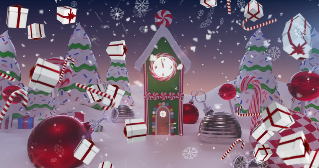 This captivating animated scene showcases a festive display with Christmas decorations and snow falling gently amidst vibrant ornaments and gifts. Perfect for holiday greeting cards, event backgrounds, or promoting festive-themed products, this videory evokes warmth and celebration.