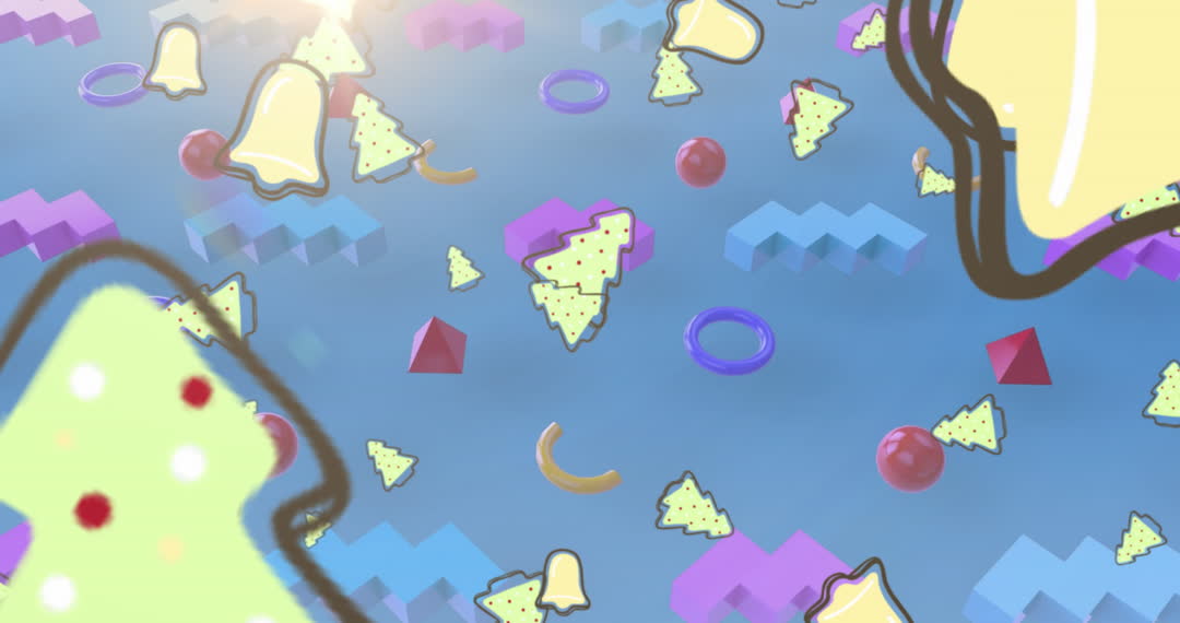 Colorful and whimsical digital Christmas animation featuring festive icons like trees, bells, and geometric shapes. Great for holiday packaging design, festive backgrounds, and creative Christmas-themed marketing materials. Ideal for bringing a modern touch to traditional holiday aesthetics.